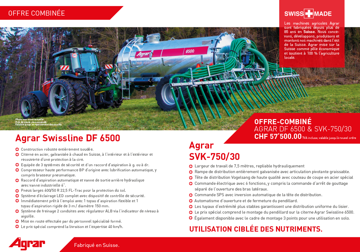 Avec notre offre combinée, Agrar Swissline DF 6500 et Agrar SVK-750/30, vous êtes prêts.